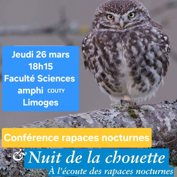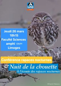Rejoignez nous ce jeudi 26 mars 2026 à 18H15 dans l’amphi Couty de la FST pour une conférence – sortie sur les rapaces nocturnes animée par A. Sanchez (LPO)
