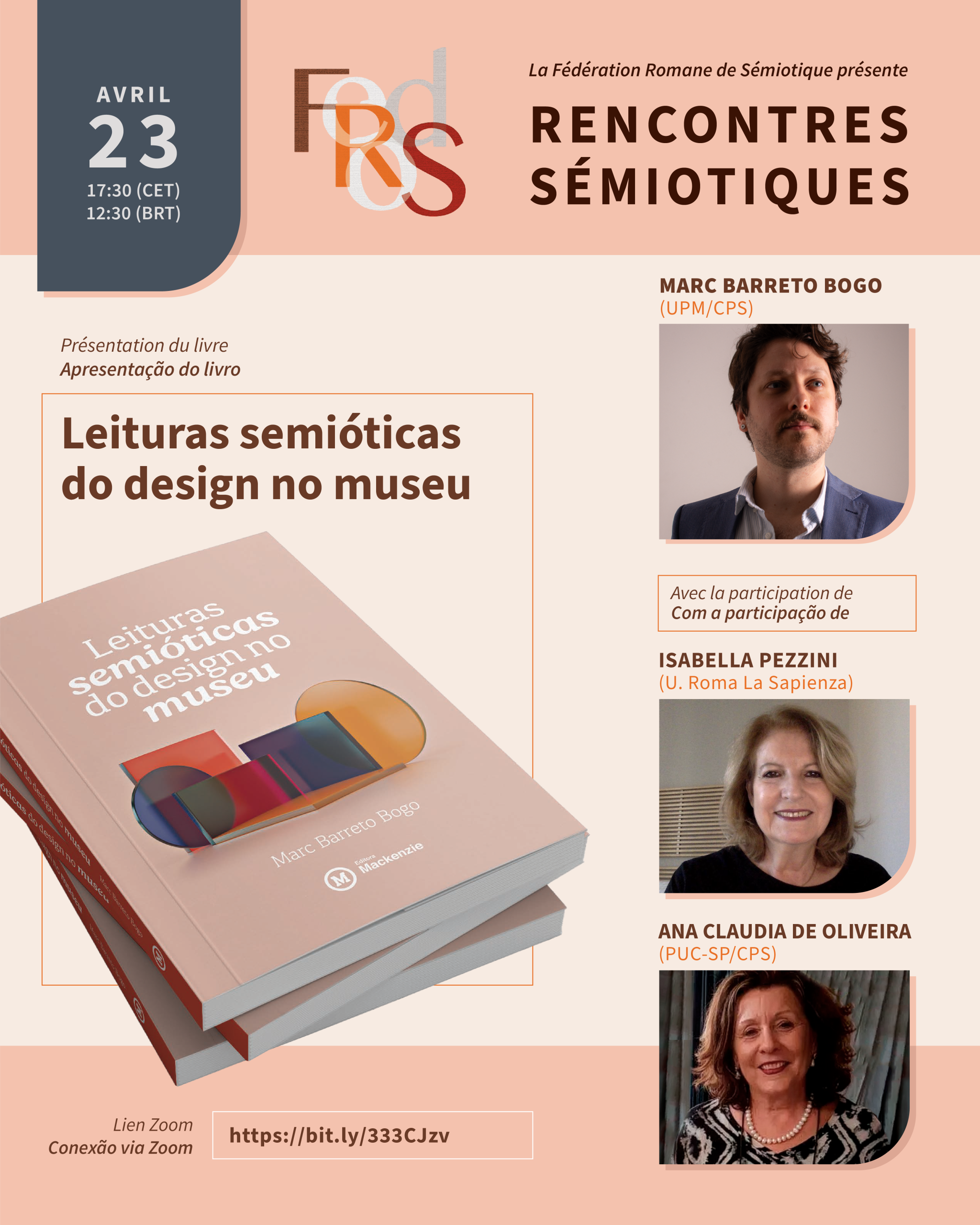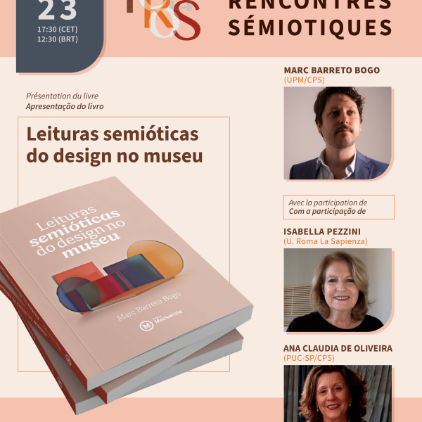 Pour donner suite à nos rencontres, le 23 avril à 17h30 (heure de Paris), nous aurons le plaisir de nous réunir pour échanger sur l’ouvrage Leituras semióticas do design no museu de Marc Barreto Bogo (Universidade Presbiteriana Mackenzie).