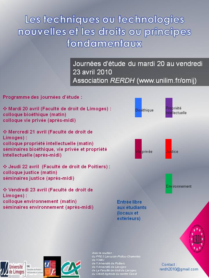 Le premier colloque du R.E.R.D.H. s’est déroulé sur quatre jours en avril 2010. Il a rassemblé plus d’une soixantaine d’intervenants et a connu un franc succès. Outre son sujet original, ce colloque fut bi-site : les interventions se déroulant sur le site tant de Limoges que de Poitiers. Le titre originel de cette manifestation était « Les techniques ou technologies nouvelles et les droits ou principes fondamentaux ». L’intitulé est devenu, avec plus de clarté et de souplesse, « Technique et droits humains ».
